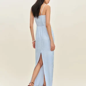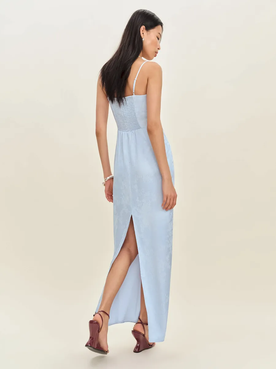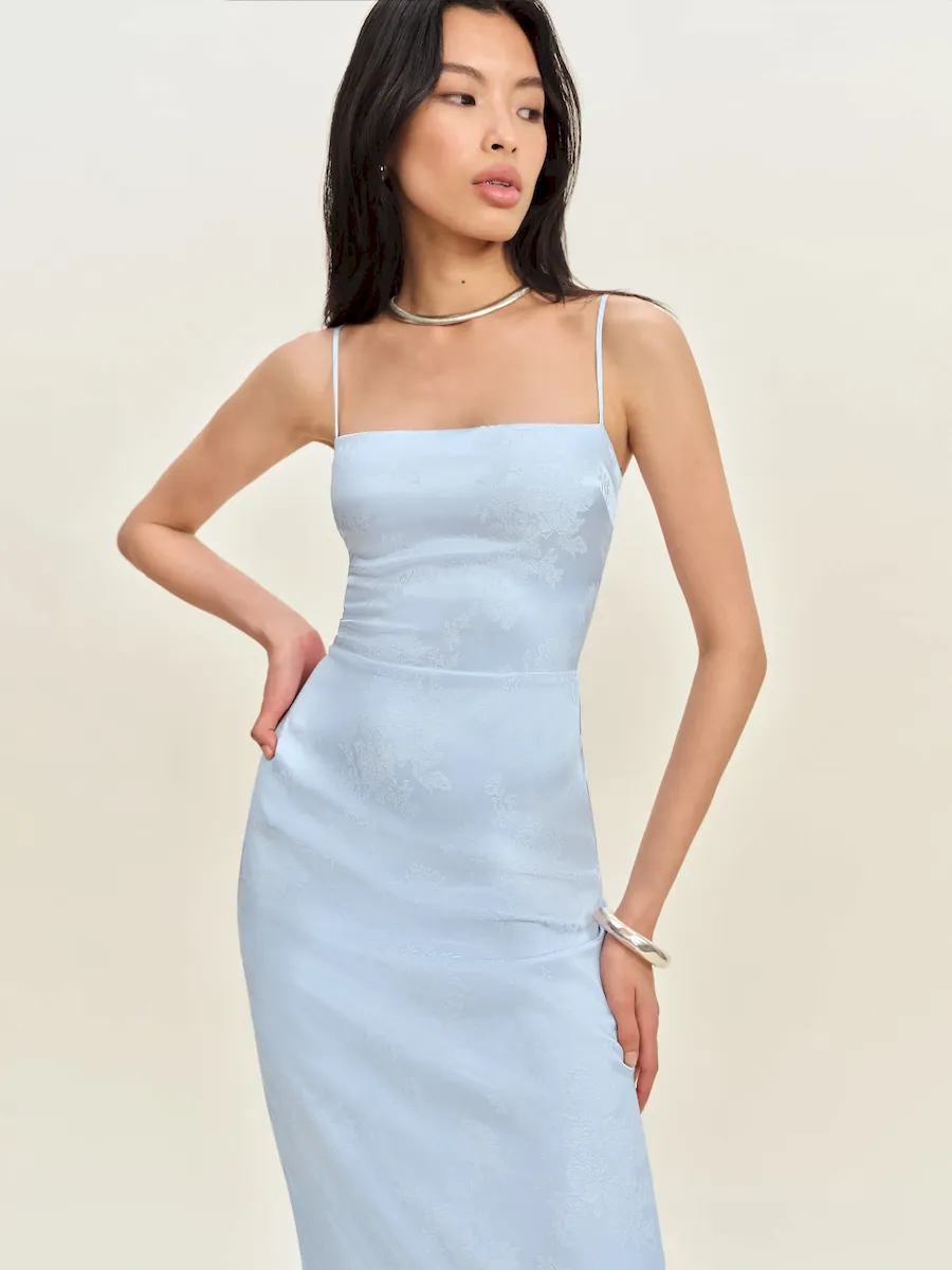 adjustable straps, straight neckline, back slit.