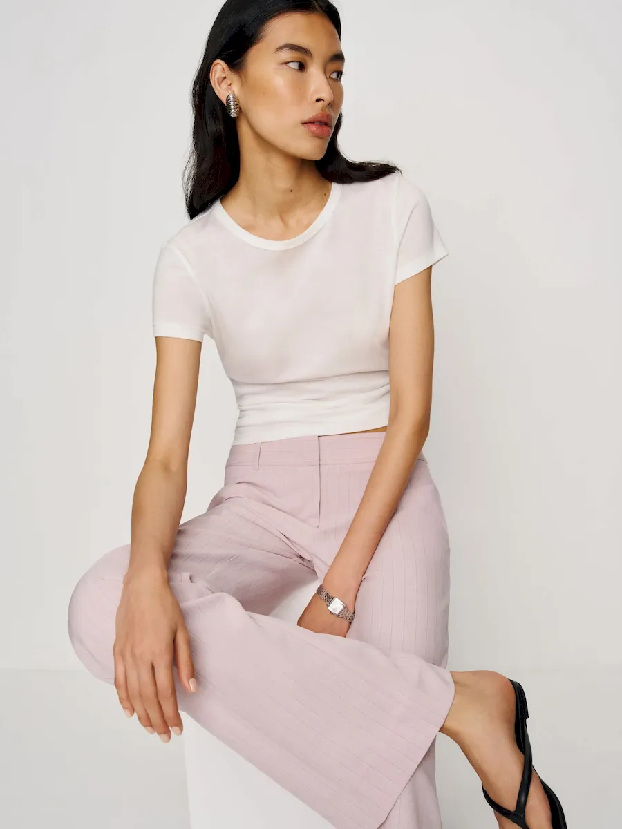 The model is wearing a size 0 and has a 24.5″ waist, 34.5″ hips.