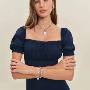 The model is wearing a size 0 and is 5’9″, 23″ waist, 34″ hips, 32″ bust.