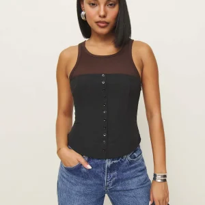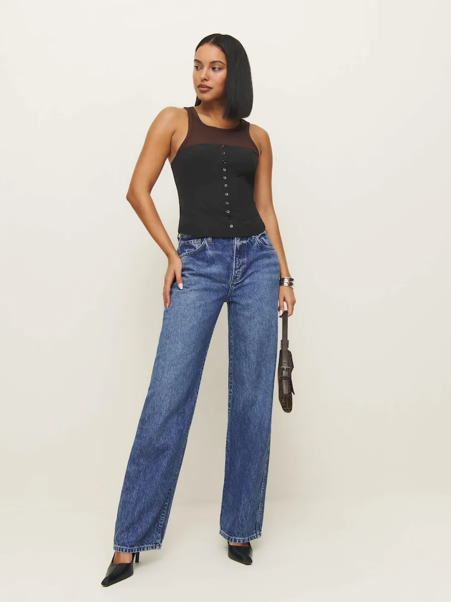 The model is wearing a size 0 and is 5’9″, 23.5″ waist, 34″ hips, 34″ bust.