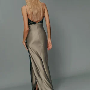 The model is wearing a size 0 and is 5’10”, 24″ waist, 35″ hips, 31″ bust.