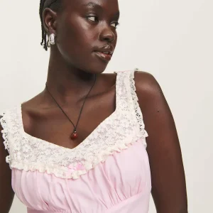 The model is wearing a size 0 and is 5’10”, 25″ waist, 35″ hips, 32″ bust.