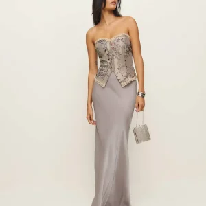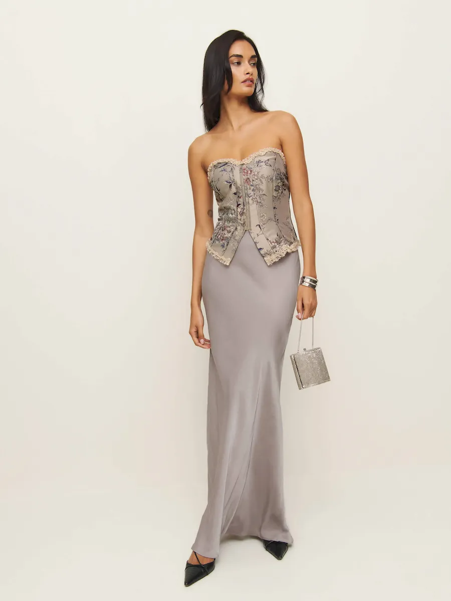 The model is wearing a size 0 and is 5’9″, 25″ waist, 35″ hips, 32″ bust.