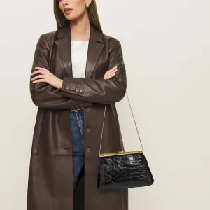 An oversized tailored croc embossed bovine skin. Spot clean. More onfabric & care.
