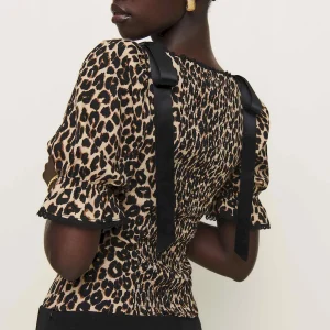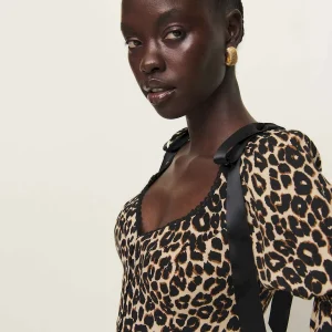 The model is wearing a size 0 and is 5’10”, 25″ waist, 35″ hips, 32″ bust.