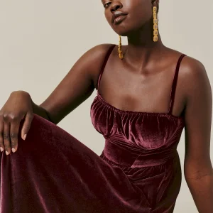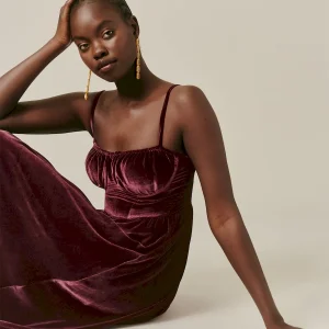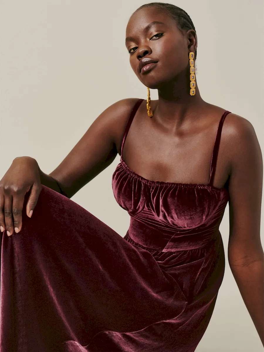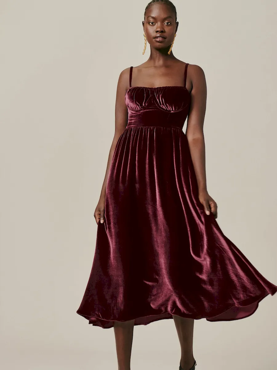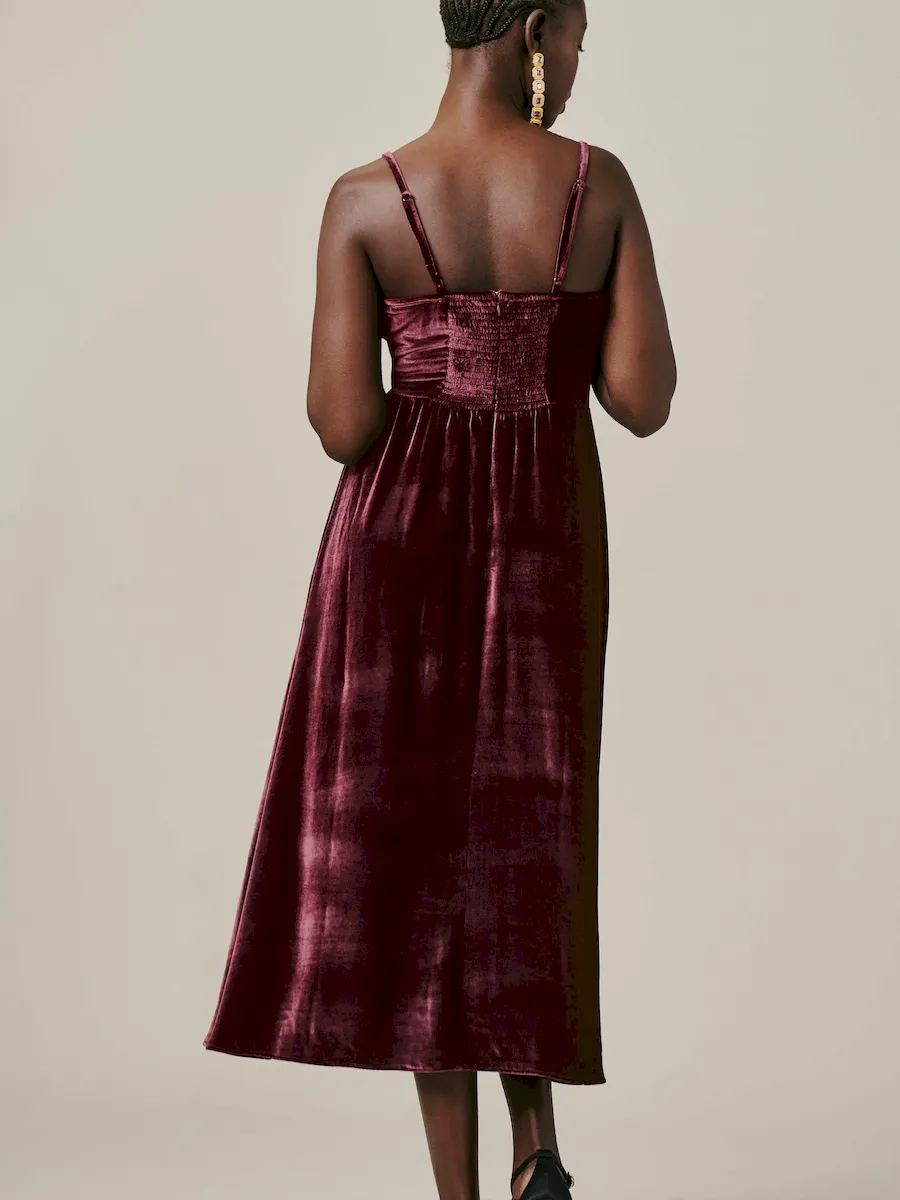 This is a soft, non-stretch velvet with a medium pile – 82% rayon, 18% silk Dry clean only. More onfabric & care.