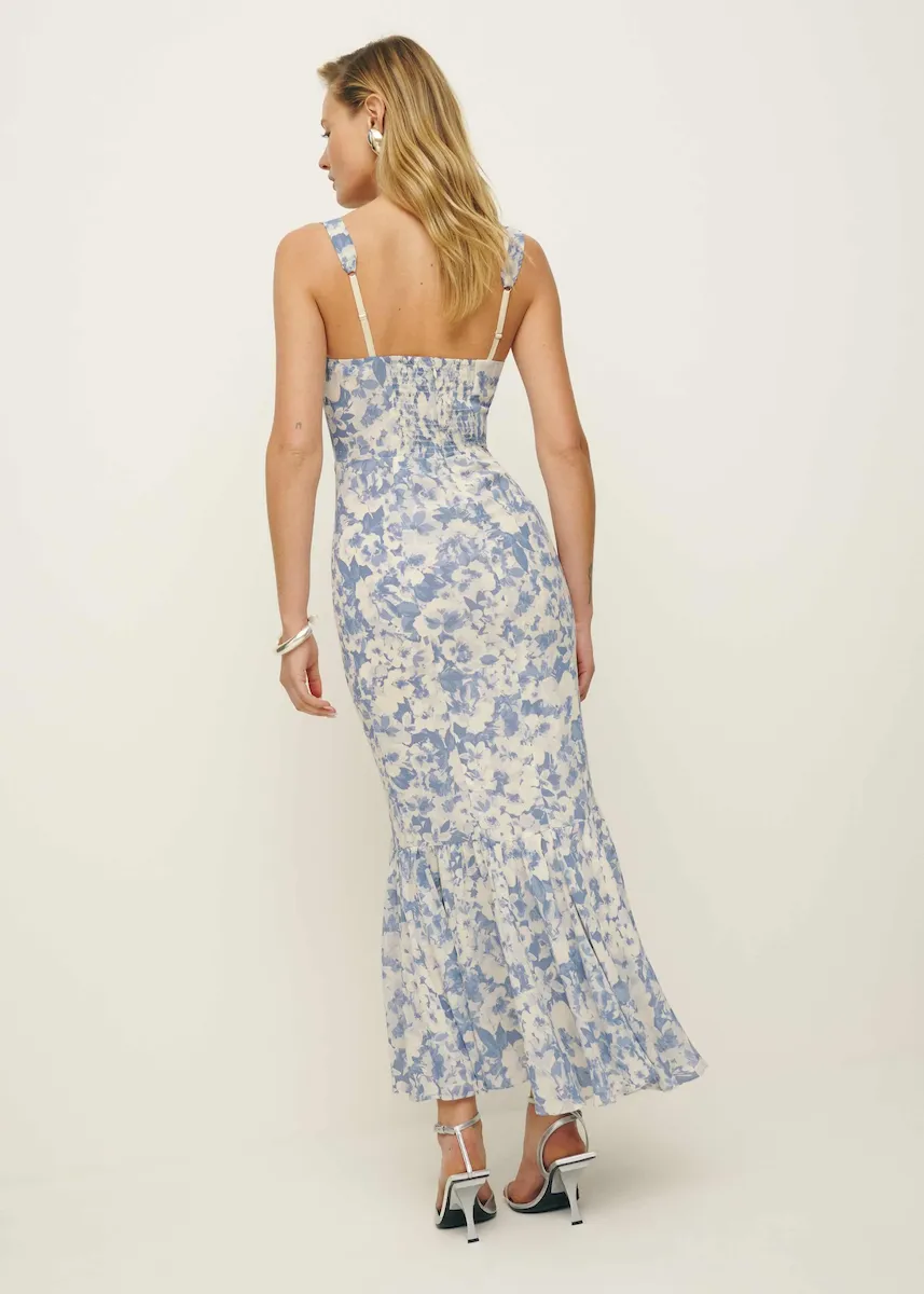 back smocking, adjustable straps, sweetheart neckline, back slit.