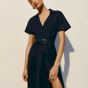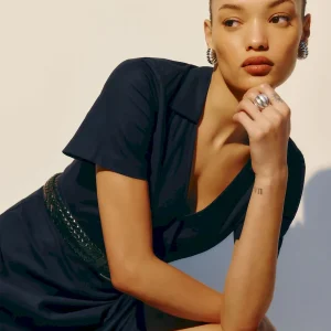 The model is wearing a size 0 and is 5’9.5″, 24″ waist, 34.5″ hips, 32″ bust.