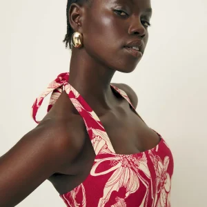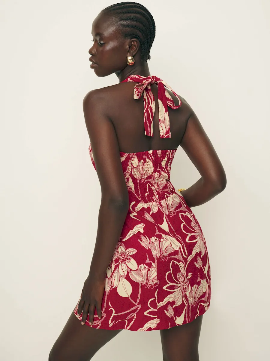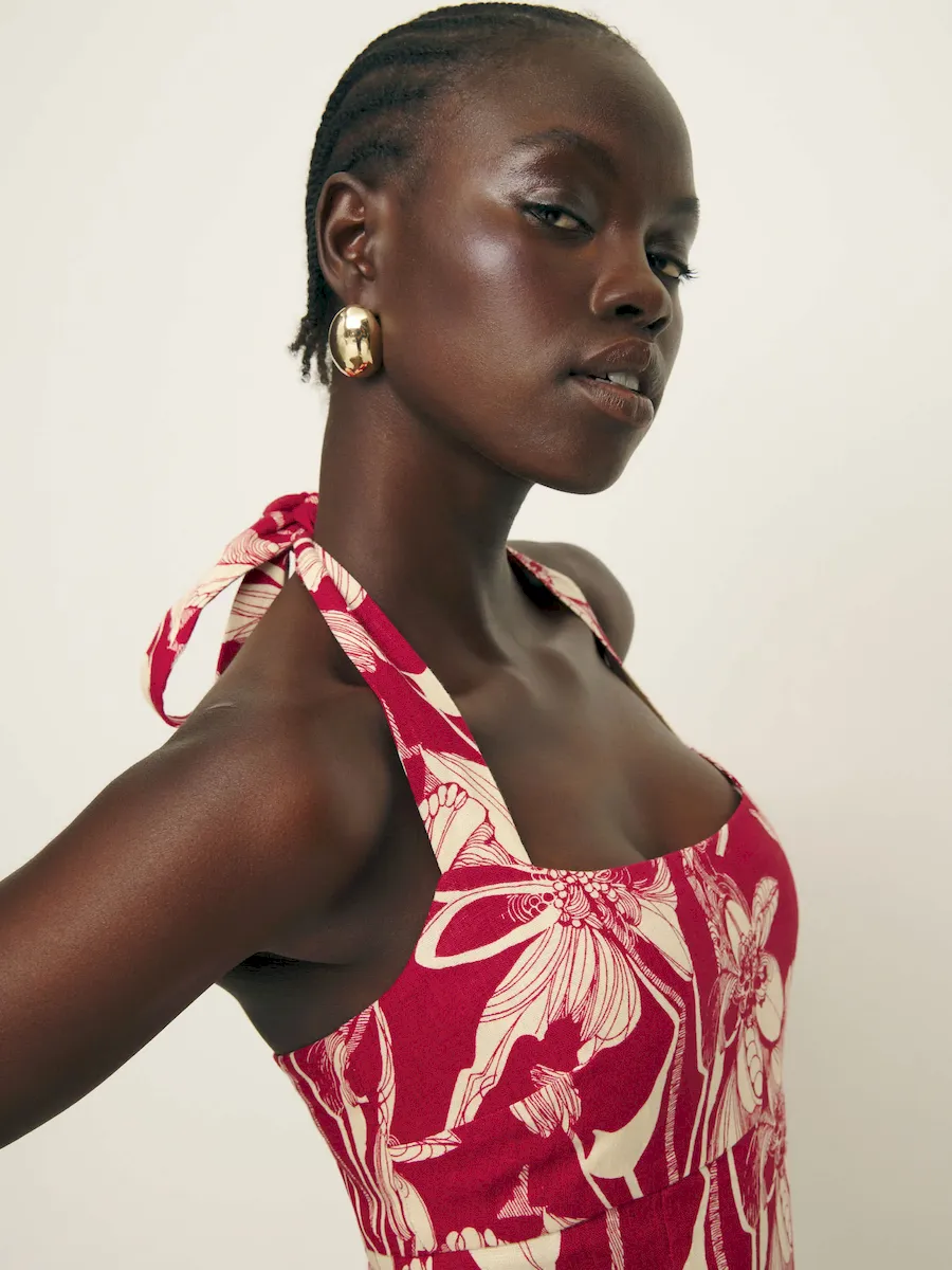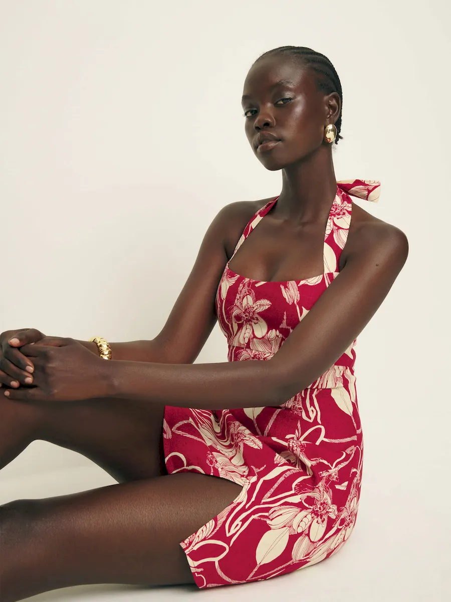The model is wearing a size 0 and is 5’10”, 25″ waist, 35″ hips, 32″ bust.