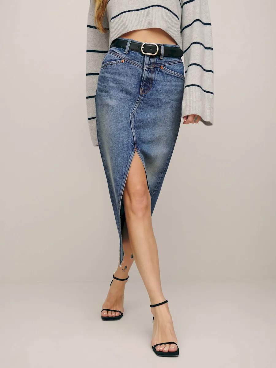 The model is wearing a size 25 and has a 25″ waist, 34.5″ hips.