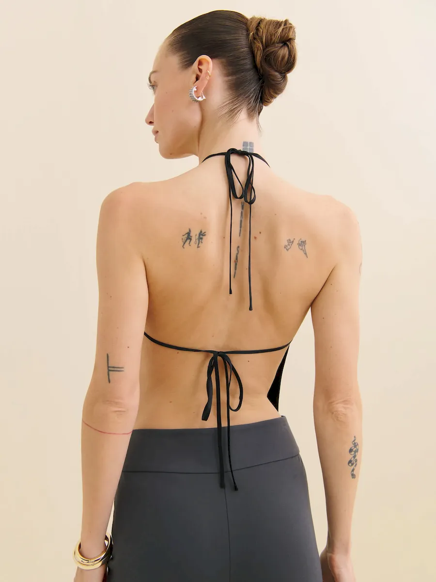 The model is wearing a size 0 and is 5’10”, 25″ waist, 34.5″ hips, 31″ bust.