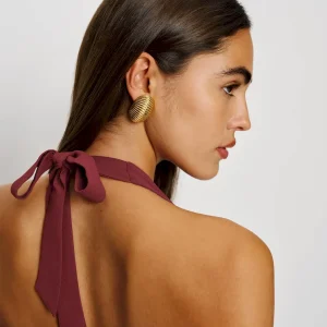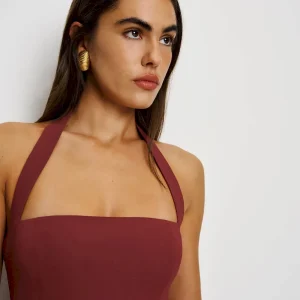 The model is wearing a size 0 and is 5′ 9.5″, 24″ waist, 34.5″ hips, 34″ bust.