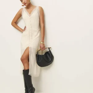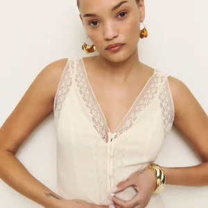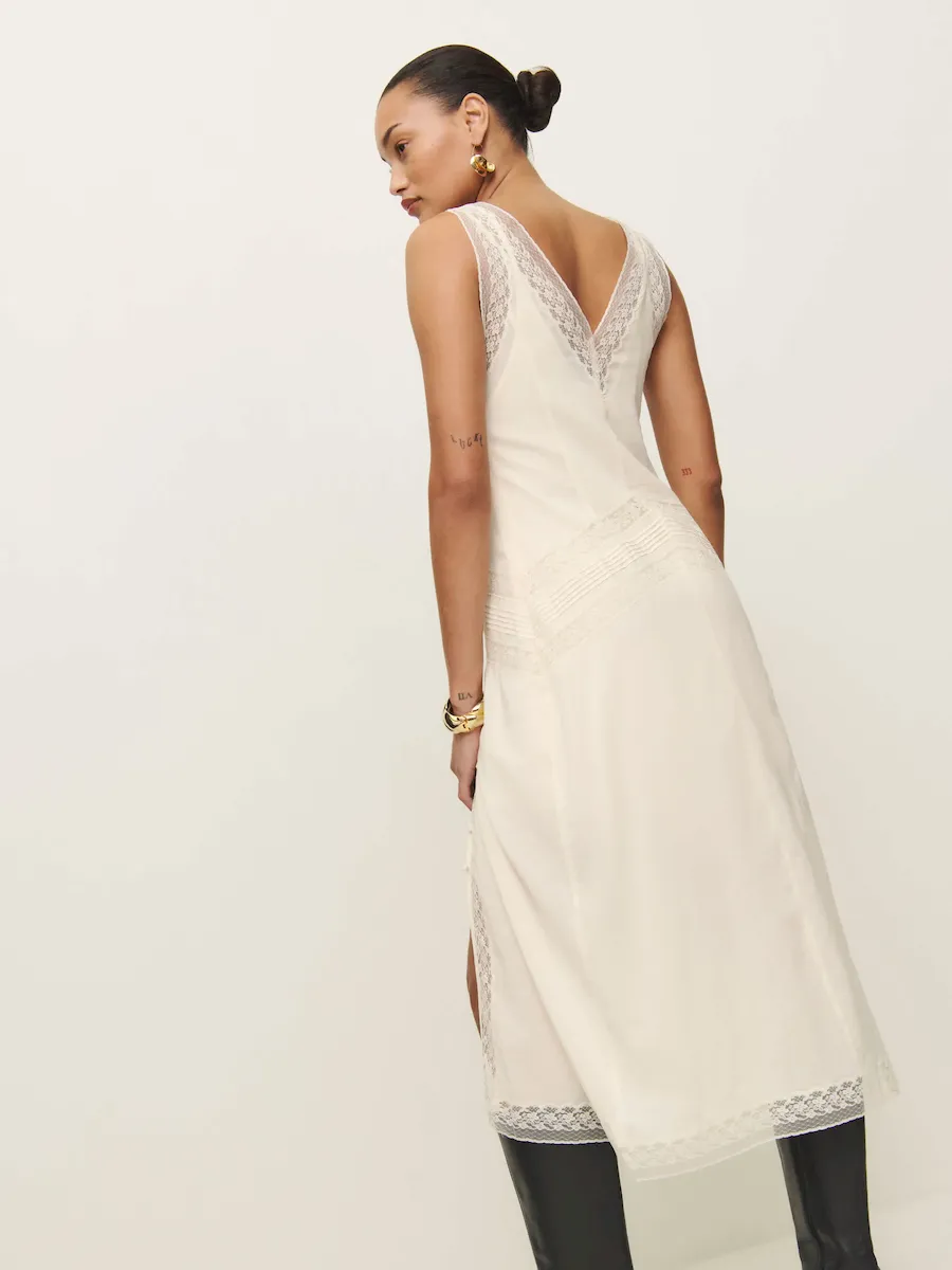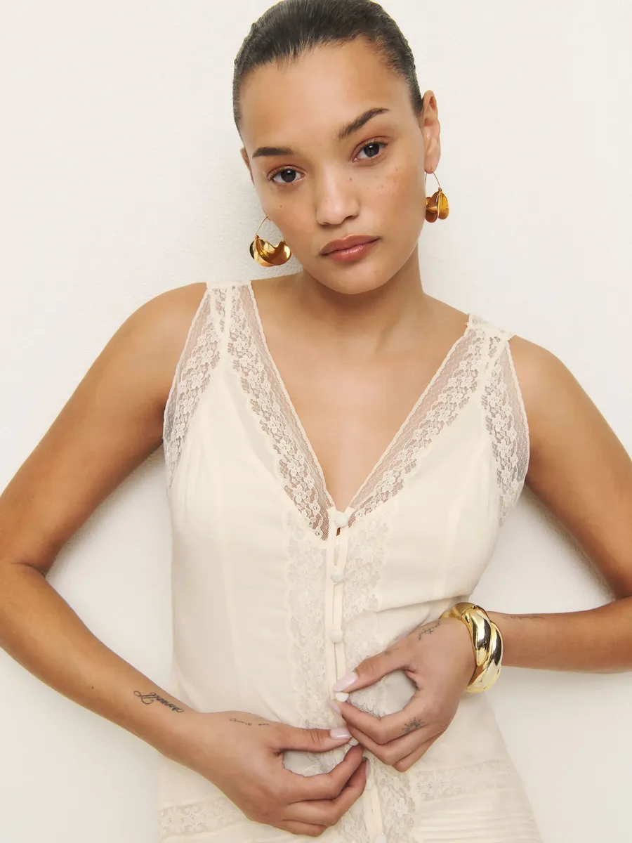 The model is wearing a size 0 and is 5’10”, 23″ waist, 34″ hips, 32″ bust.