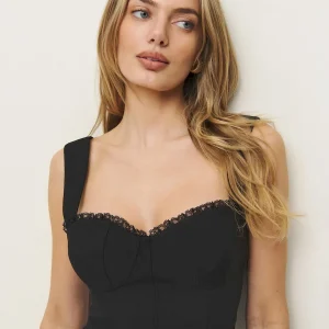 The model is wearing a size 0 and is 5’9″, 24″ waist, 34.5″ hips, 33″ bust.