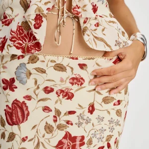 The model is wearing a size 0 and has a 24″ waist, 34″ hips.