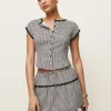 The model is wearing a size 0 and is 5′ 9.5″, 24″ waist, 34.5″ hips, 34″ bust.