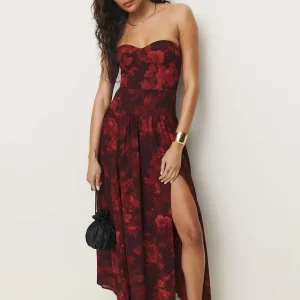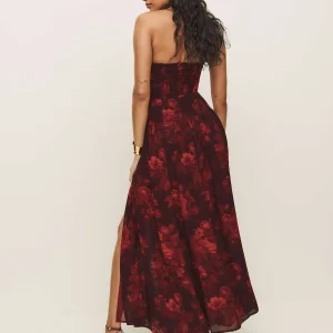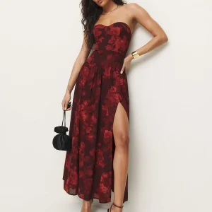 back smocking, sweetheart neckline, front slit.