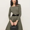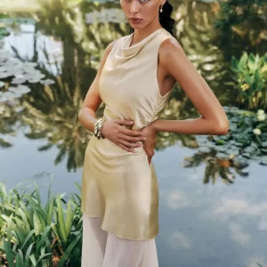 The model is wearing a size 0 and is 5’8″, 23″ waist, 35.5″ hips, 30″ bust.