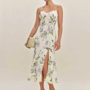 The model is wearing a size 2 and is 5’10”, 25″ waist, 36″ hips, 34″ bust.