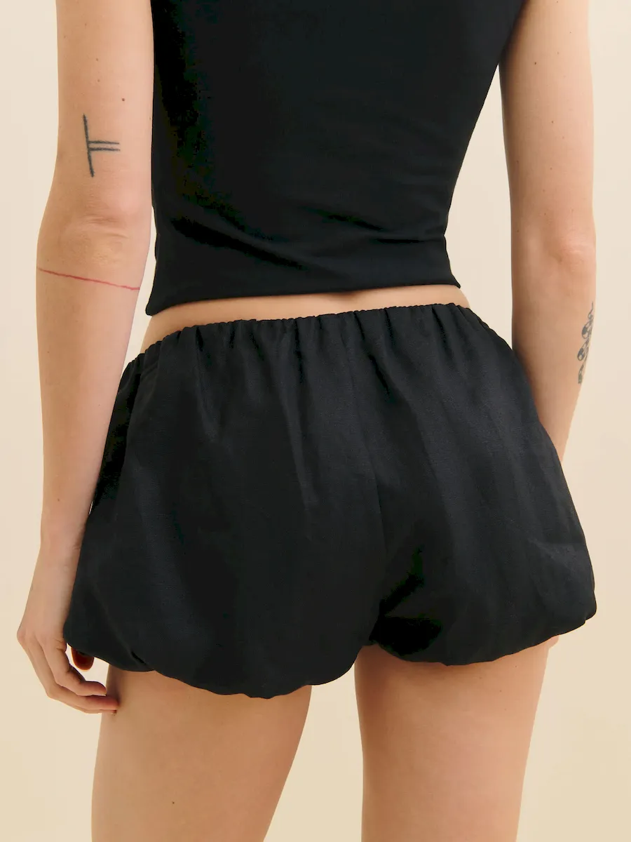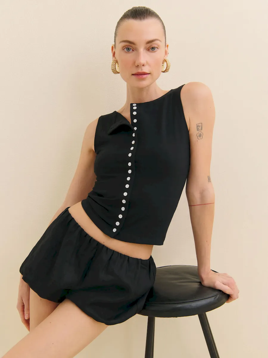The model is wearing a size XS and has a 25″ waist, 34.5″ hips.