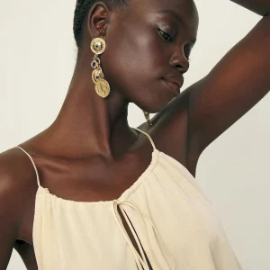 The model is wearing a size XS and is 5’10”, 25″ waist, 35″ hips, 32″ bust.