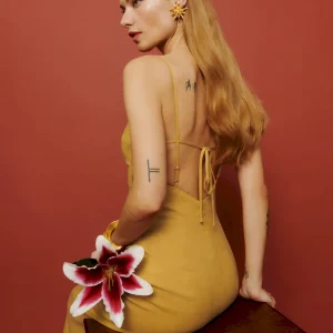 The model is wearing a size 0 and is 5’7″, 23″ waist, 34″ hips, 32″ bust.