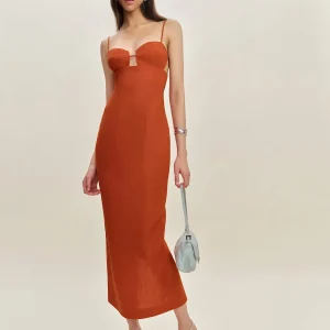 The model is wearing a size 0 and is 5’10”, 24″ waist, 35″ hips, 31″ bust.