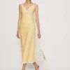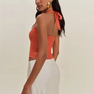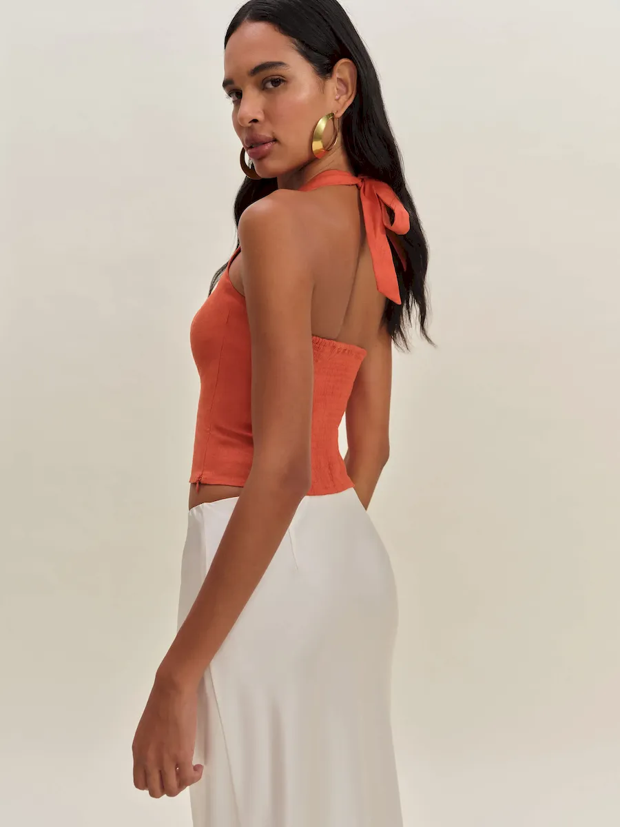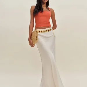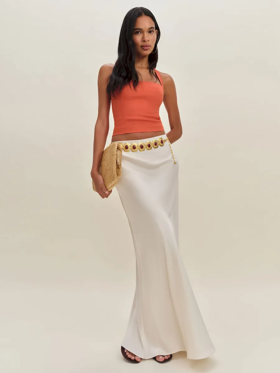 The model is wearing a size 0 and is 5’11”, 24″ waist, 35″ hips, 31″ bust.