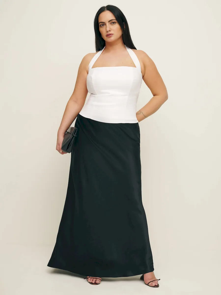The model is wearing a size 14 and is 5’8″, 33″ waist, 47″ hips, 41″ bust.