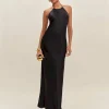 The model is wearing a size 0 and is 5’10”, 24″ waist, 33.5″ hips, 30″ bust.