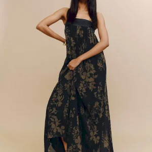 features a 100% silk strapless neckline band and a georgette skirt.