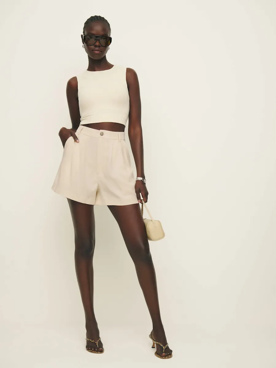 The model is wearing a size 0 and has a 25″ waist, 35″ hips.