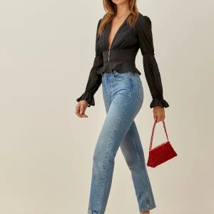 The model is wearing a size 0 and is 5’8″, 24″ waist, 34″ hips, 32″ bust.