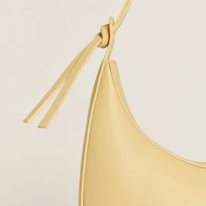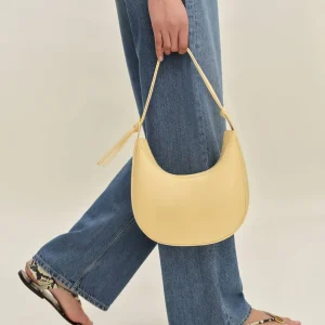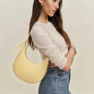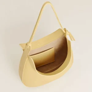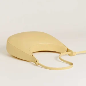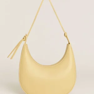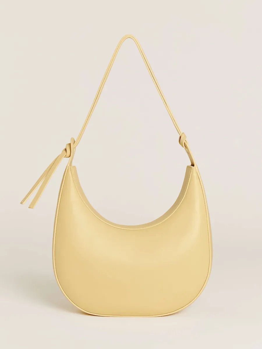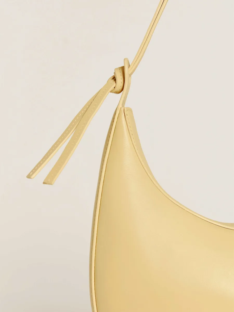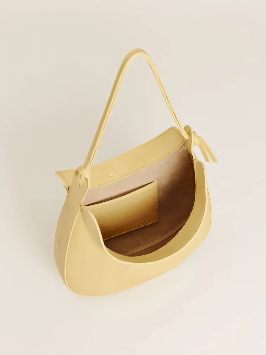 crescent shaped leather shoulder bag with a decorative tie detailand interior pockets.