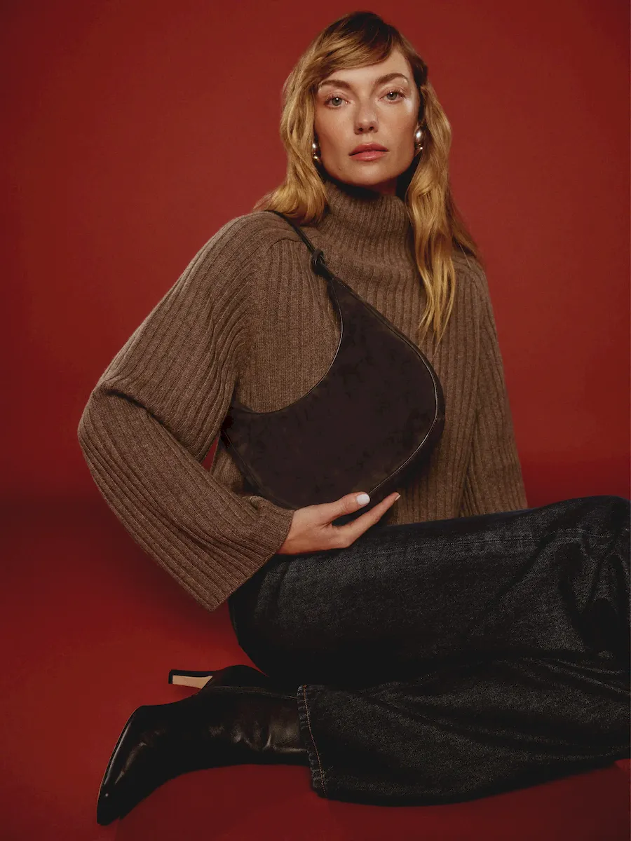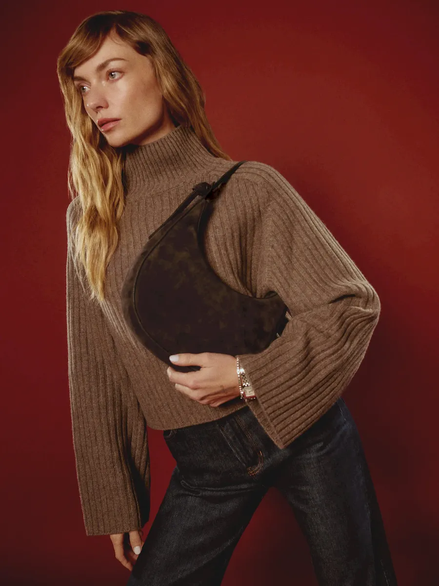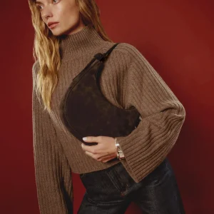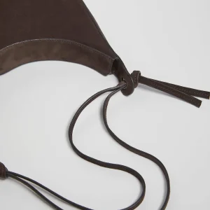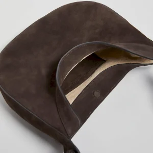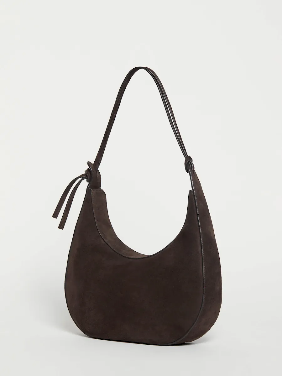 crescent shaped leather shoulder bag with a decorative tie detailand interior pockets.