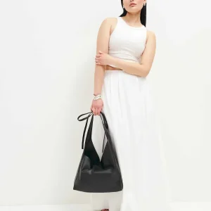 a slouchy tote with a magnetic closure,features a decorative tie detail,and inside zip pocket with a card holder.