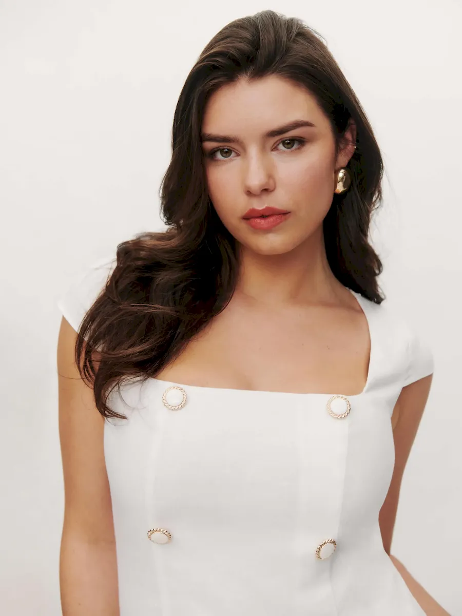The model is wearing a size 8 and is 5’7″, 28″ waist, 45″ hips, 35.5″ bust.
