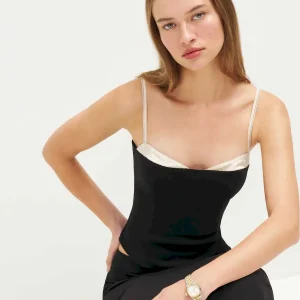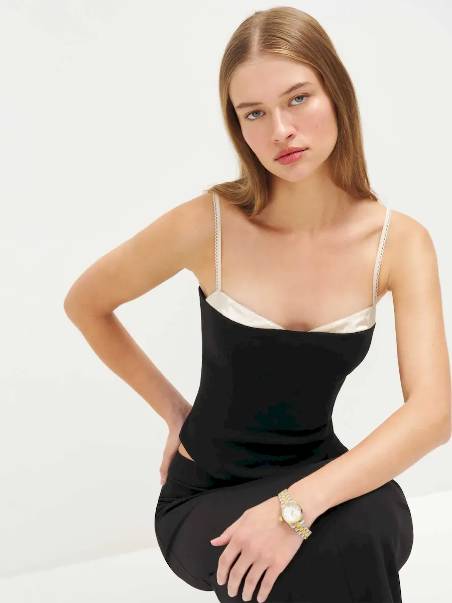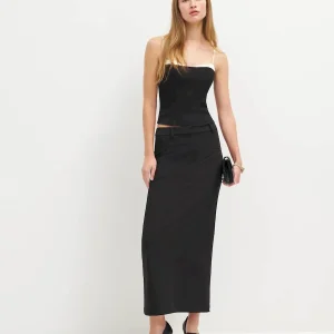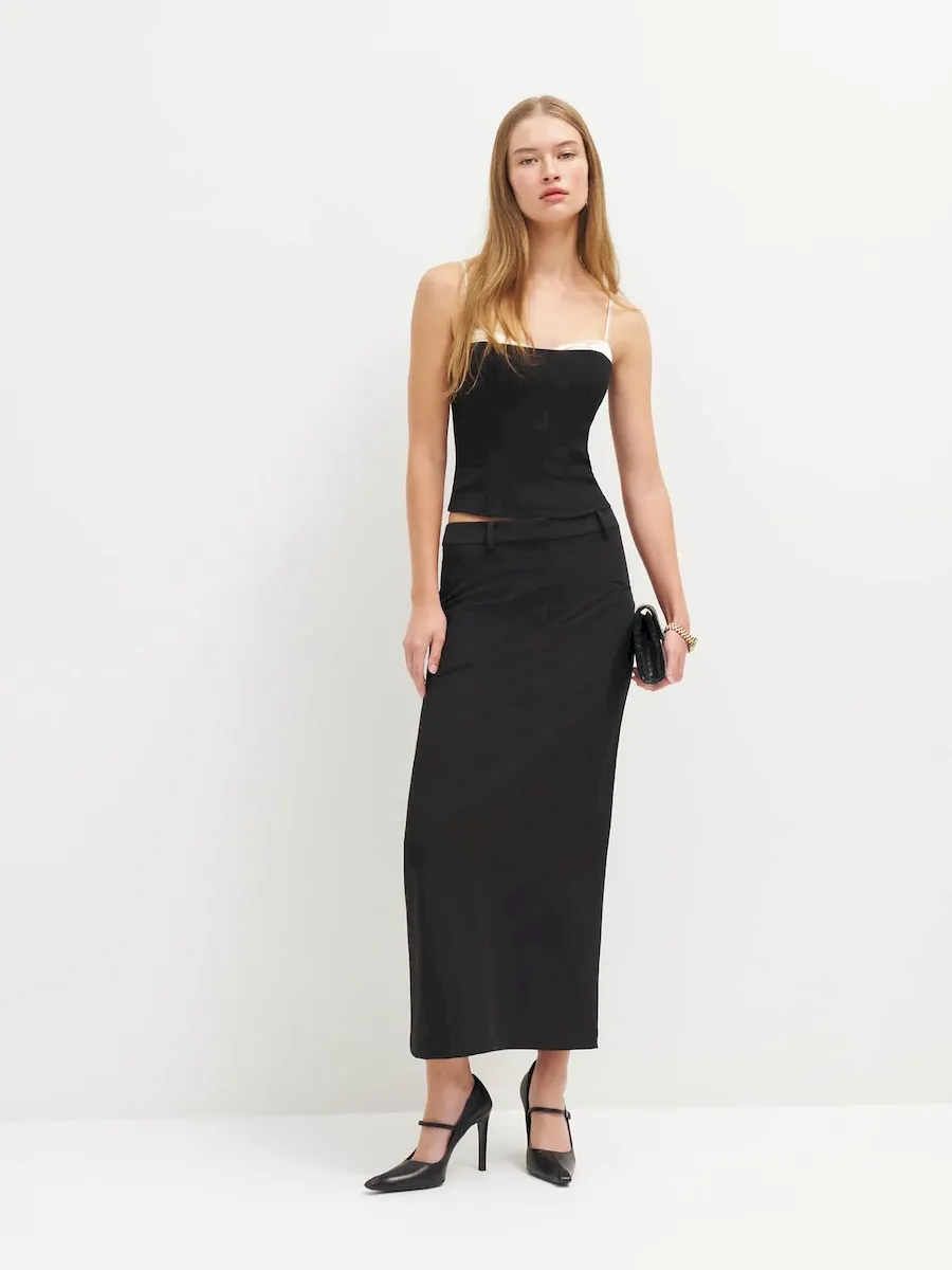 The model is wearing a size 2 and is 5’8 ½”, 24 ½” waist, 34″ hips, 30″ bust.