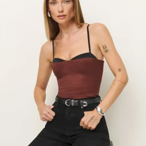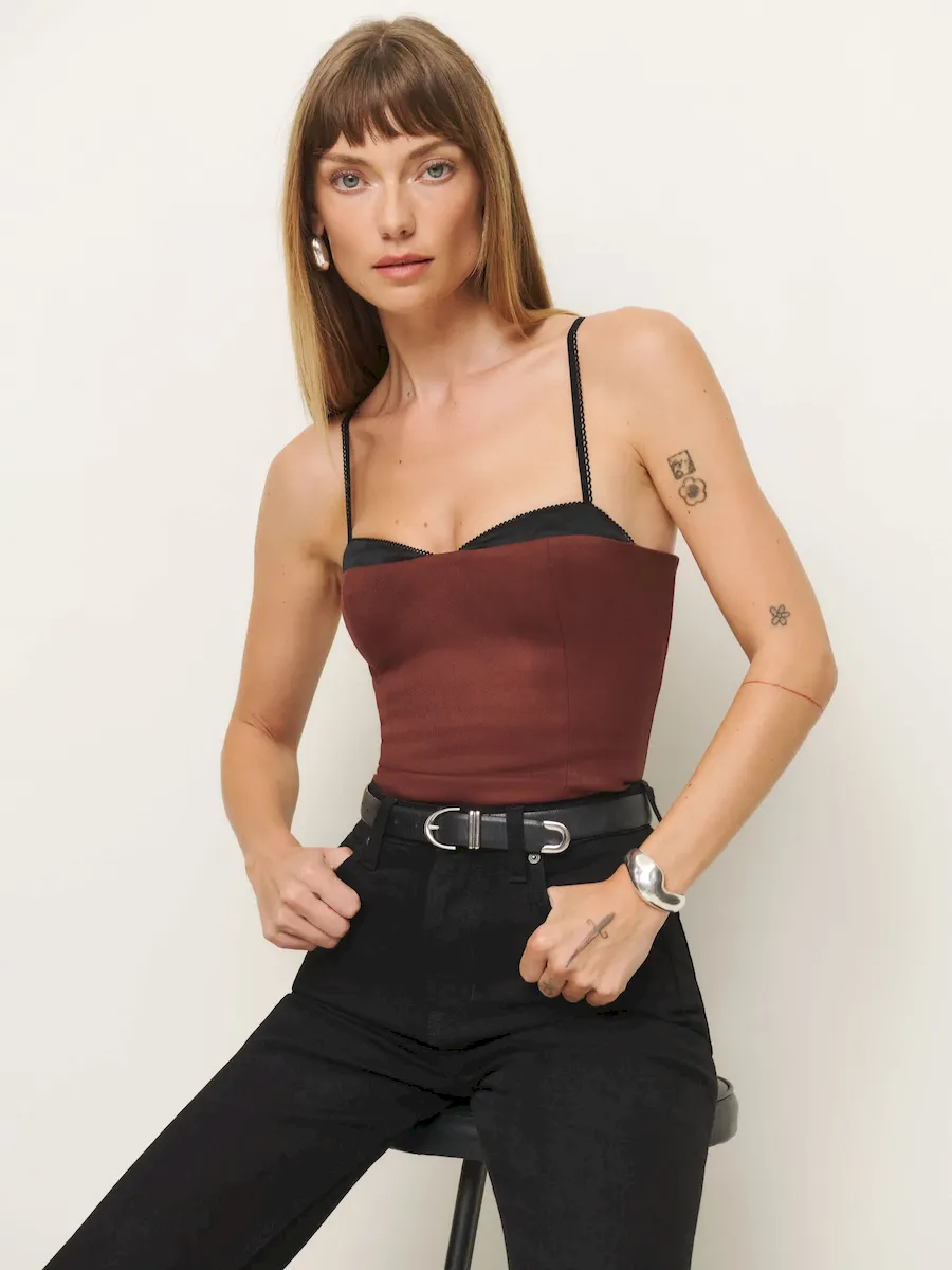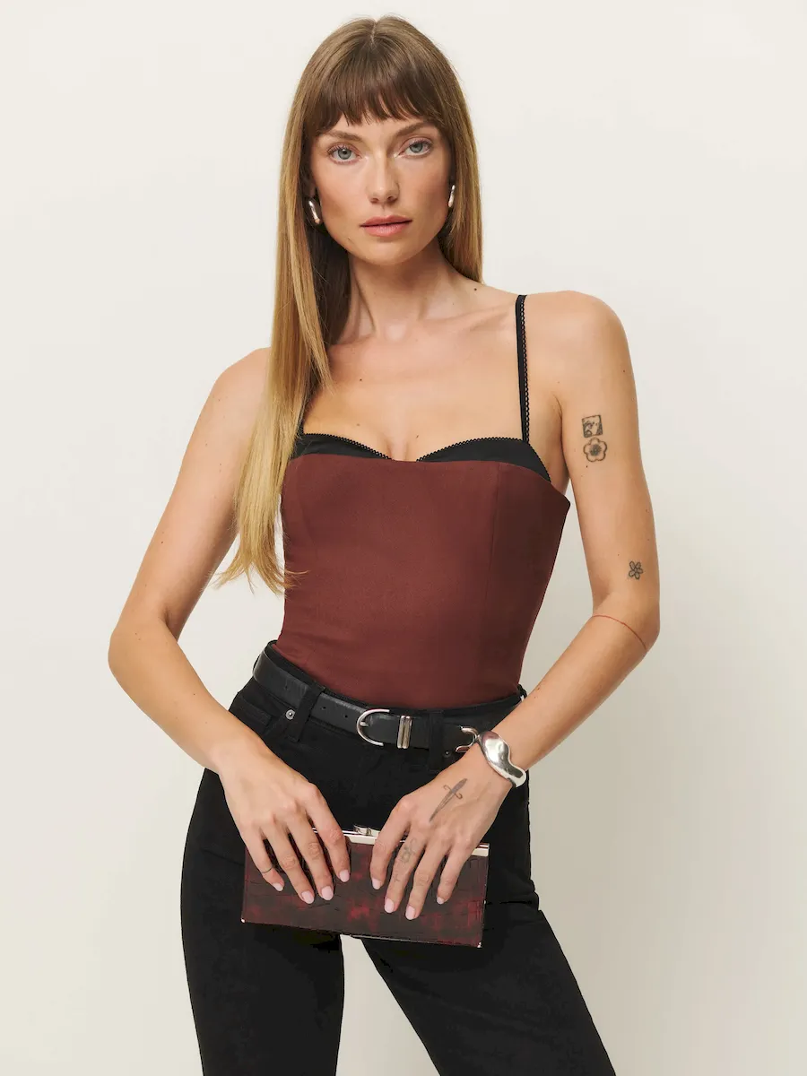 The model is wearing a size 0 and is 5’10”, 25″ waist, 34.5″ hips, 31″ bust.
