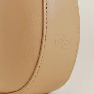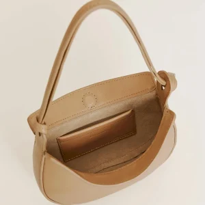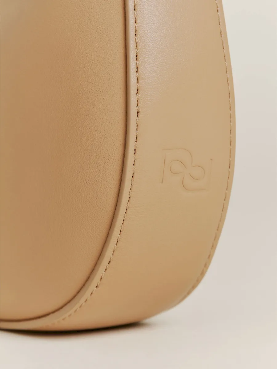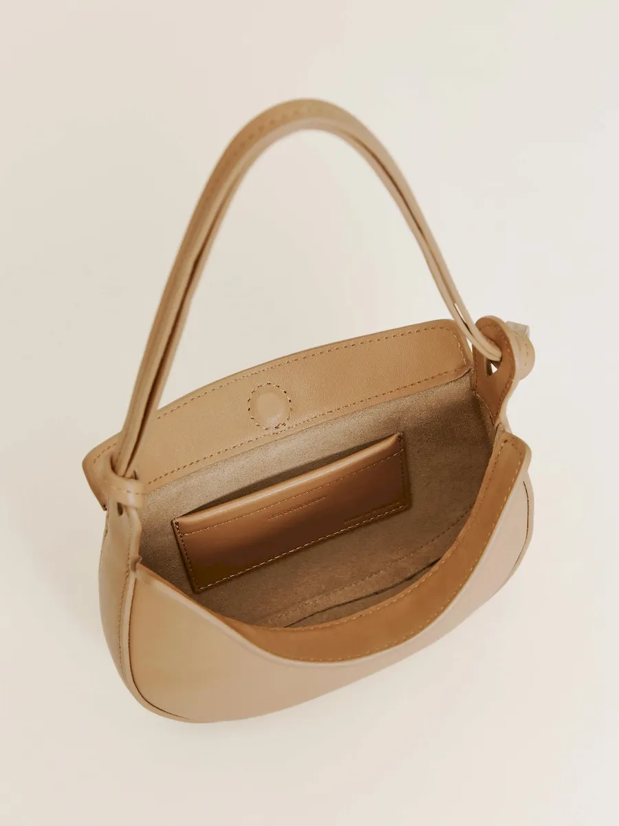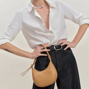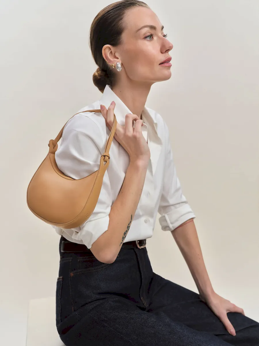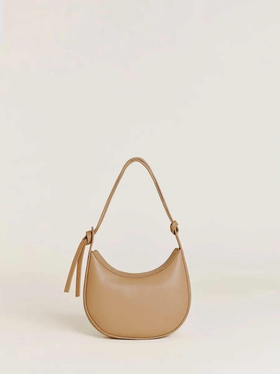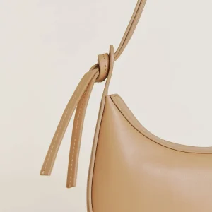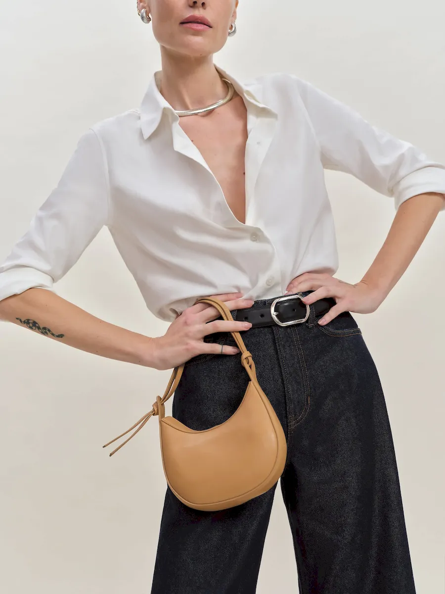 crescent shaped leather shoulder bag with a decorative tie detailand interior pockets.