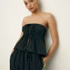 The model is wearing a size 0 and is 5’10”, 25″ waist, 34.5″ hips, 31″ bust.