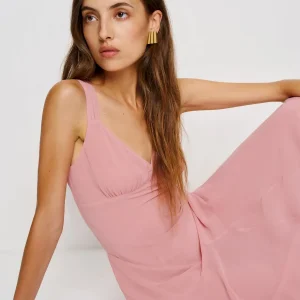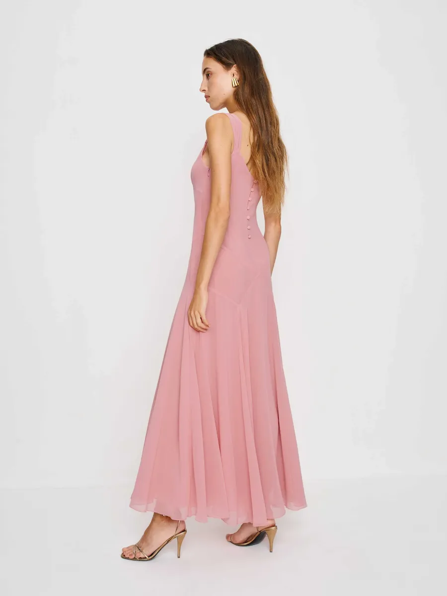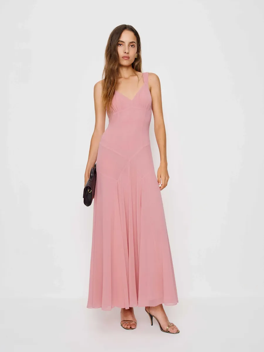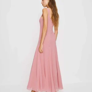 The model is wearing a size 0 and is 5’9″, 24″ waist, 34″ hips, 30″ bust.