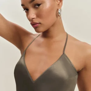 The model is wearing a size 0 and is 5’10”, 23″ waist, 34″ hips, 32″ bust.