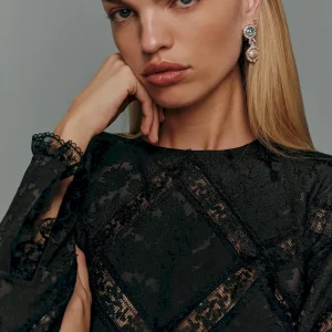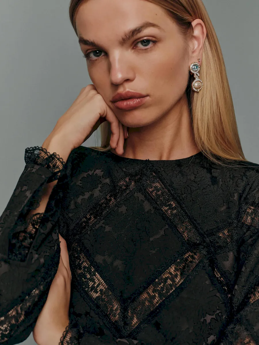 The model is wearing a size 0 and is 5’10”, 24″ waist, 35″ hips, 31″ bust.
