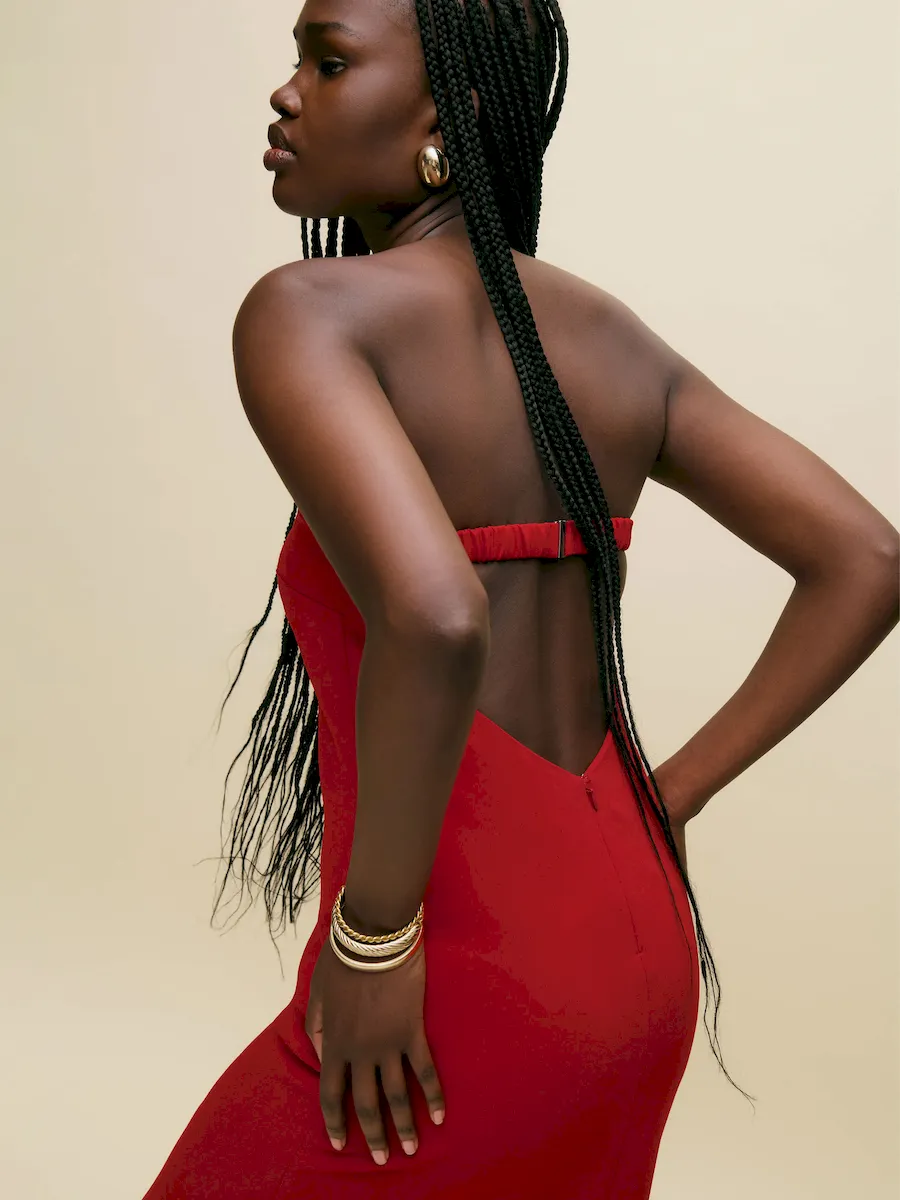 The model is wearing a size 2 and is 5’11”, 25.5″ waist, 37″ hips, 32.5″ bust.