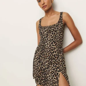 non-adjustable straps, square neckline, side slit.
