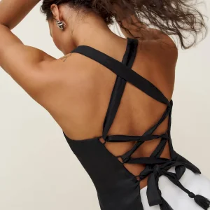 The model is wearing a size 0 and is 5’10”, 23″ waist, 34″ hips, 32″ bust.