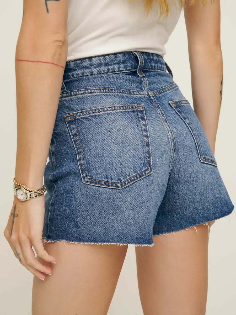 The model is wearing a size 25 and has a 25″ waist, 34.5″ hips.
