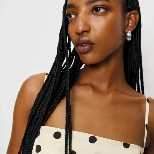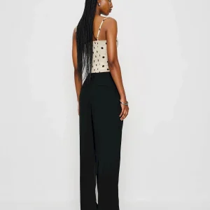 The model is wearing a size 0 and is 5’9″, 23″ waist, 34.5″ hips, 30″ bust.