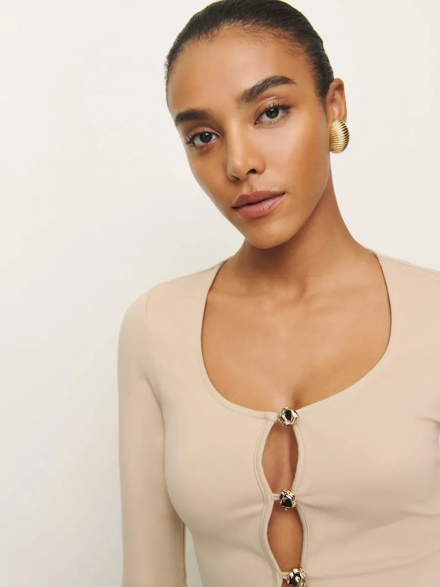 The model is wearing a size S and is 5’11”, 26″ waist, 38″ hips, 35″ bust.